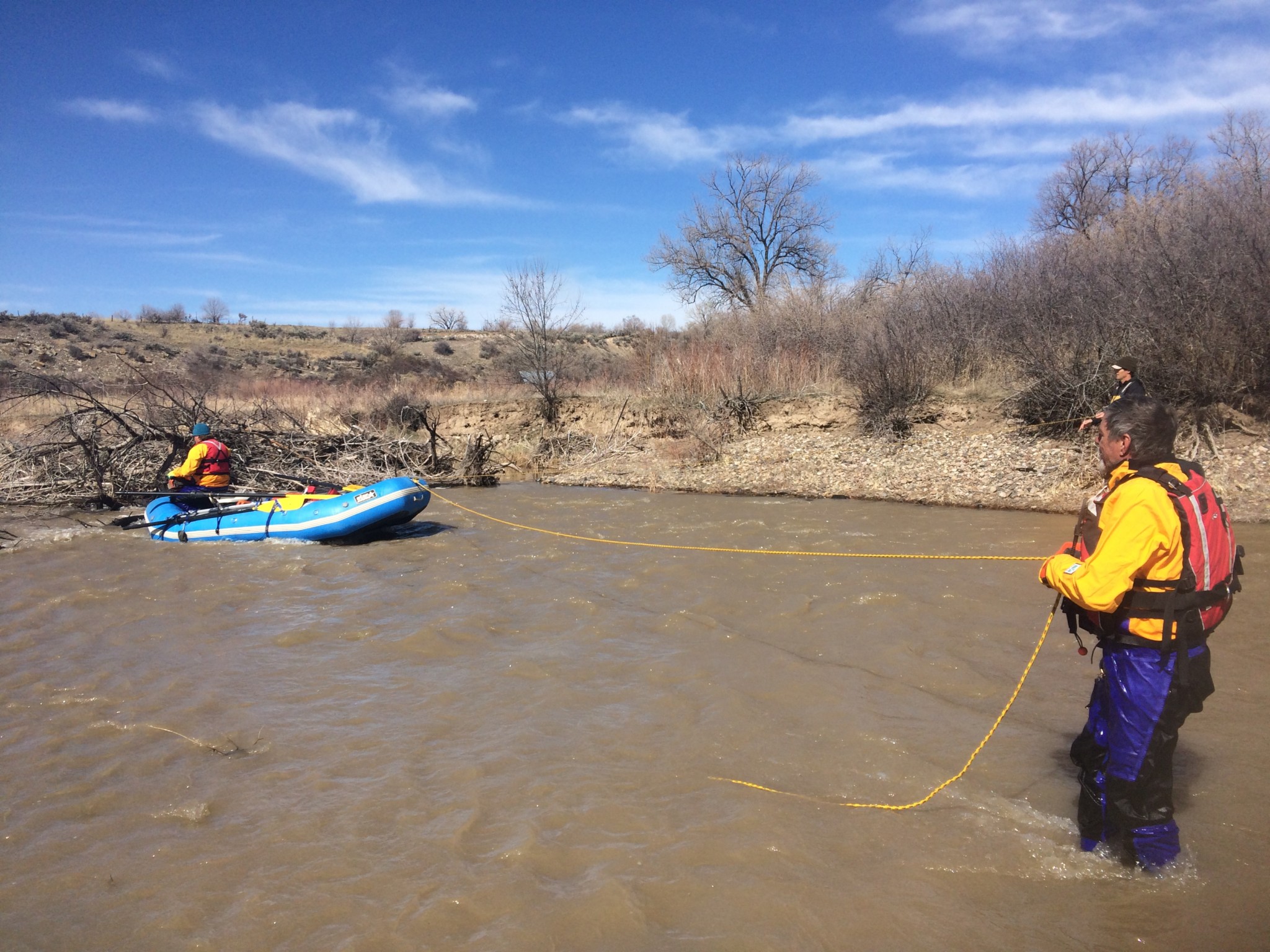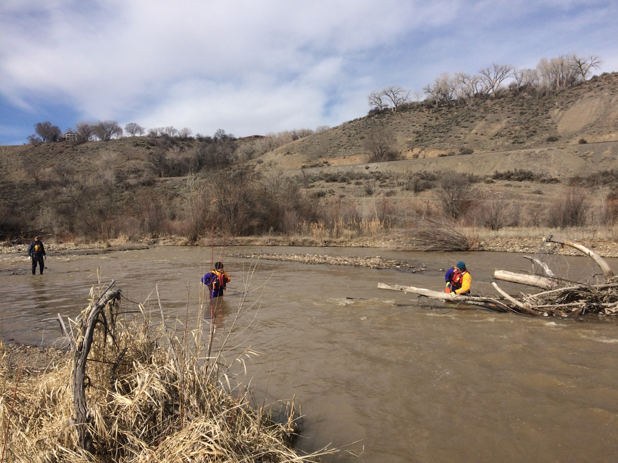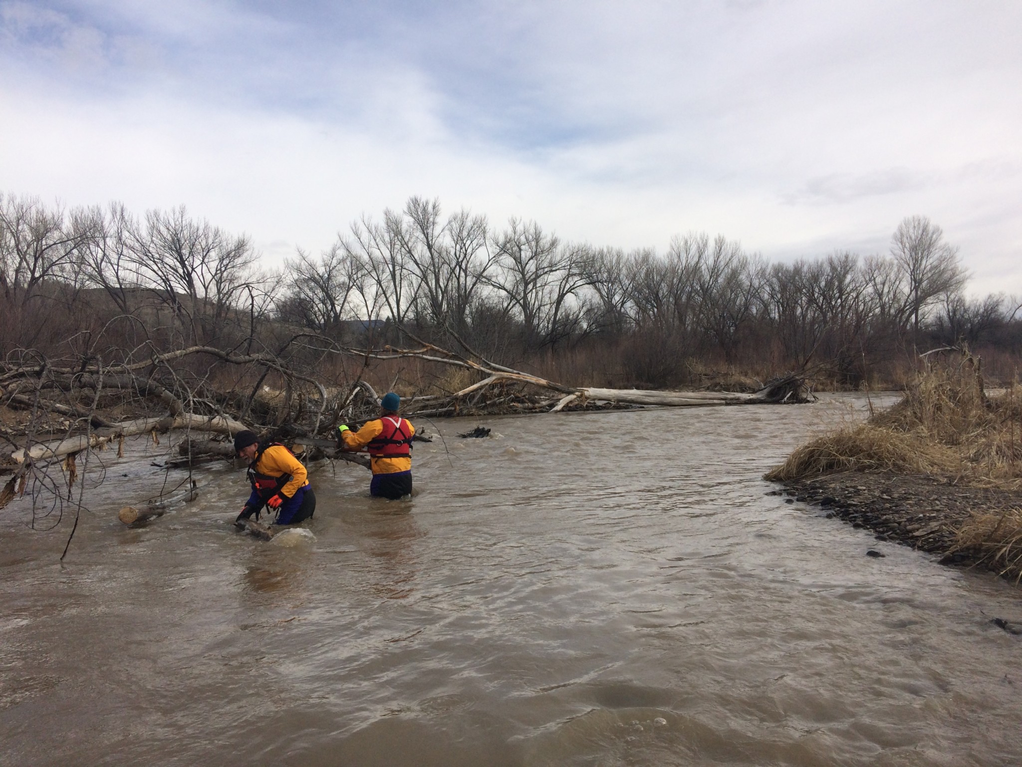 Wyatt Wilson and John Tujague of the Swift Water Rescue Team were present along with Jim Richardson and Jake Hartter of the Western Slope Conservation Center. The two groups worked with local landowner permission to remove debris piles (snags) from the main river channel. Clearing debris and snags such as these allows boaters to navigate safely downstream without having to portage around obstacles, thereby reducing the risk of trespassing on private property.