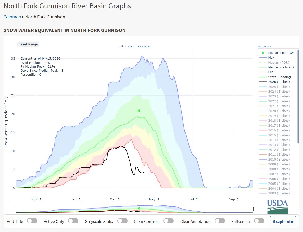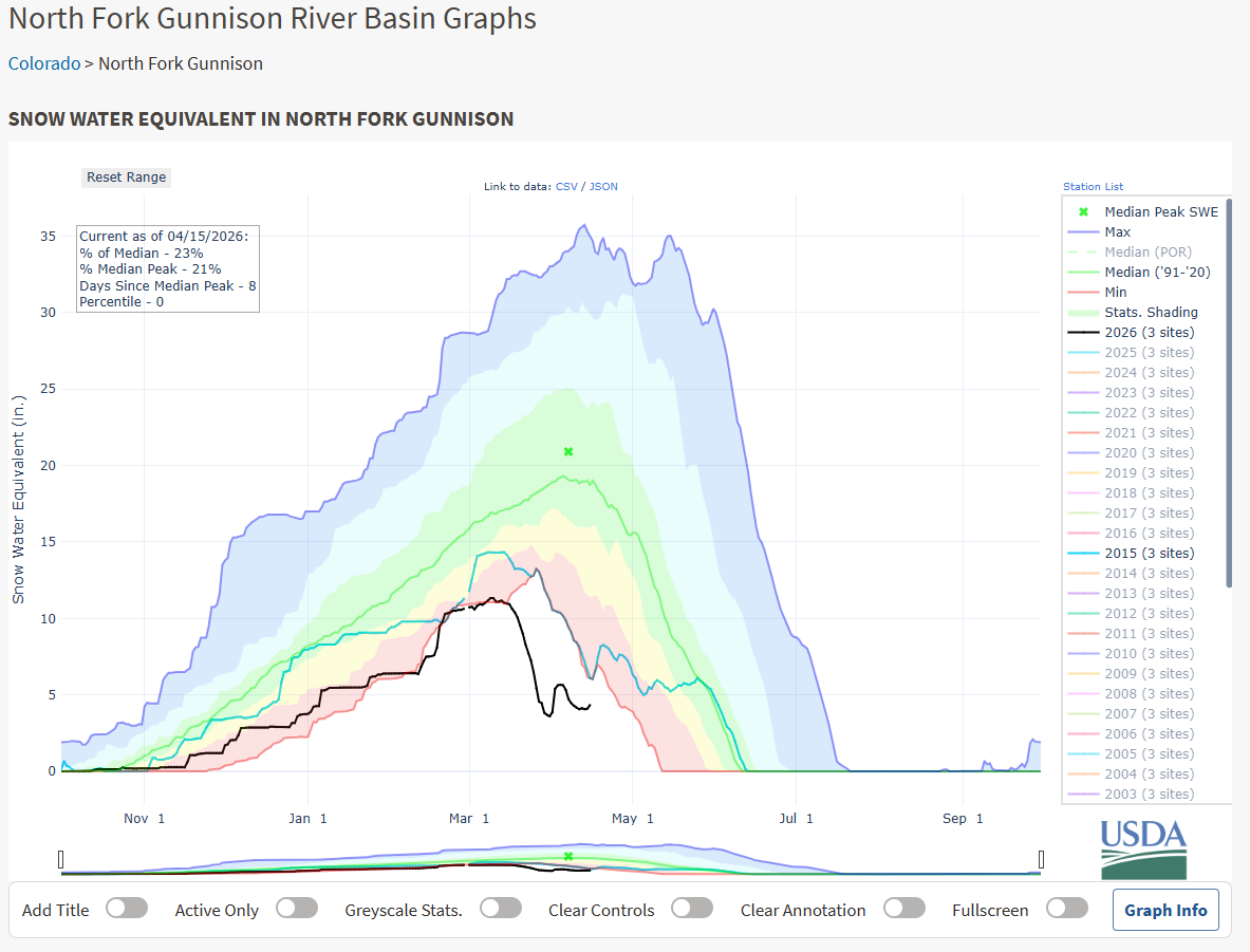 Then came March madness. No, not the college basketball tournament, but the kind of madness that sent our snowpack bouncing down the mountains into a court of oblivion. That last week of March set record breaking digits with high temperatures in the North Fork Valley exceeded 85 degrees for the entire week. The weak winter snowpack in the mountains didn’t stand a chance. Runoff began to ramp up on March 16th and by April 1st the snowpack was reduced from 64% to only 20% of average for the season, plummeting well below the lowest levels in recorded history. It wasn’t until April 1st that we came out of the March madness dive bomb, when a spring storm brought nearly 2.0 inches of rain to the North Fork Valley. Even so, the record setting meltdown had done its damage to the basin snowpack.