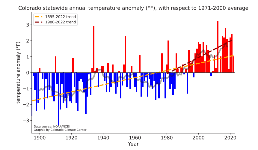 However, a different story is told when looking at average temperatures over the last 150 years (Colorado Climate Report):