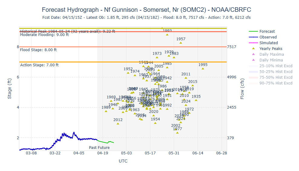 Speaking of North Fork river flows, it’s always anyone’s guess as to when the peak runoff will occur. But this year may prove to be the first time that the North Fork has reached peak runoff BEFORE the median snowpack peak. North Fork peak runoff typically occurs in mid May. However, this year with most everything running about one month ahead of schedule, it is likely that we will see diminishing flows from here on out. Below is a graph of the North Fork USGS gauge at Somerset as, displayed by the Colorado Basin River Forecast Center (CBRFC), showing historical average peaks over the last 100 years: